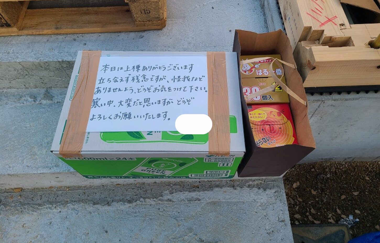 当日は強風の中での作業となりましたが、工事開始前にお施主様より心温まる差し入れが現場に用意されており、スタッフ一同とても嬉しい気持ちで一日をスタートすることができました。