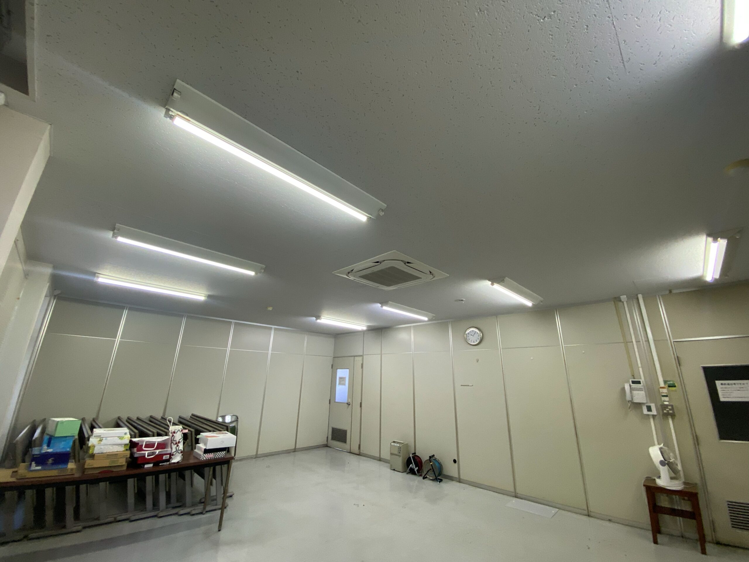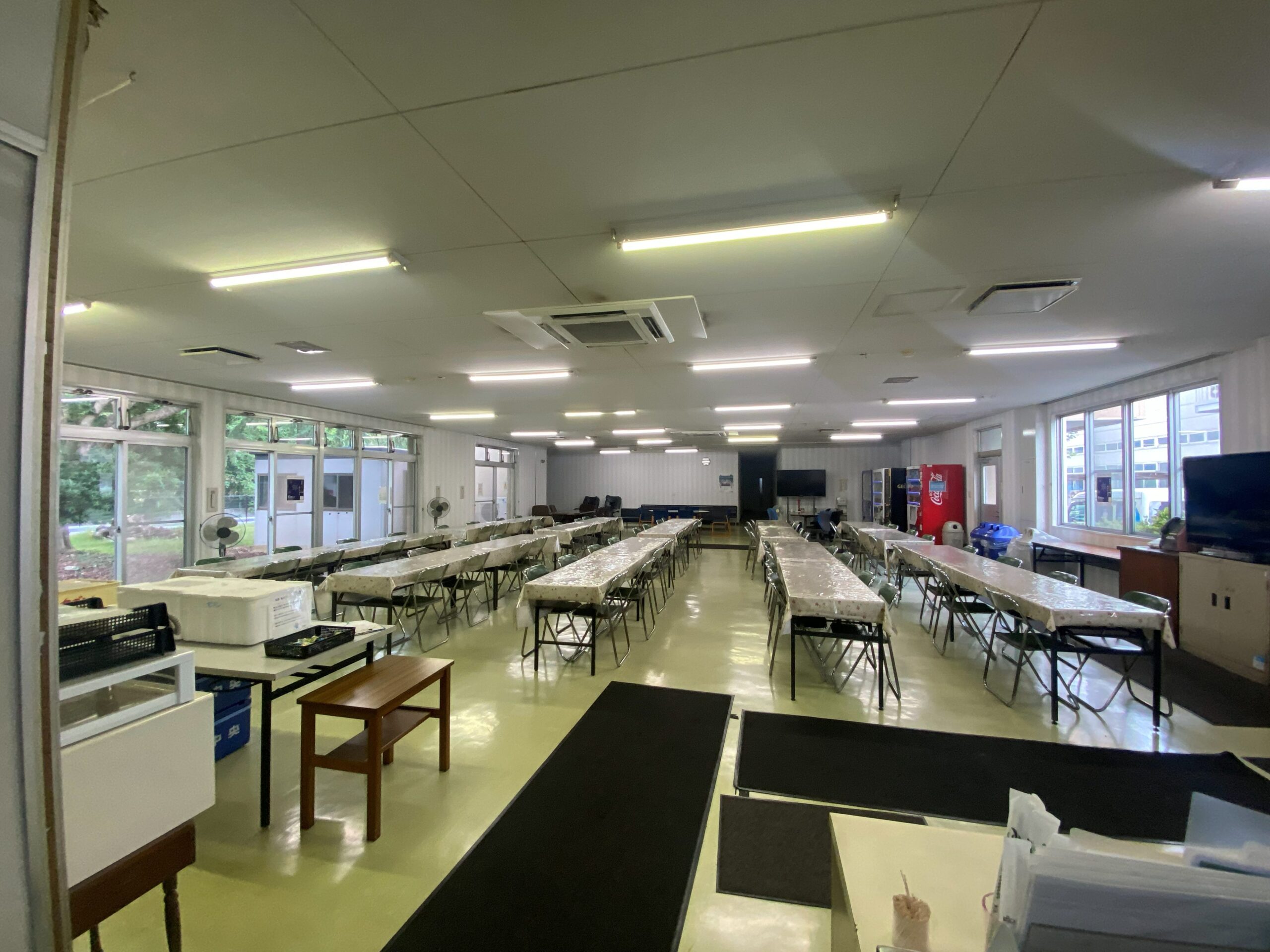 もともとは、食堂・廊下・会議室がそれぞれ区切られている間取りでしたが、今回の工事ではそれらを仕切っていたパーテーションを撤去し、ひとつながりの広々とした空間へと一新しています。