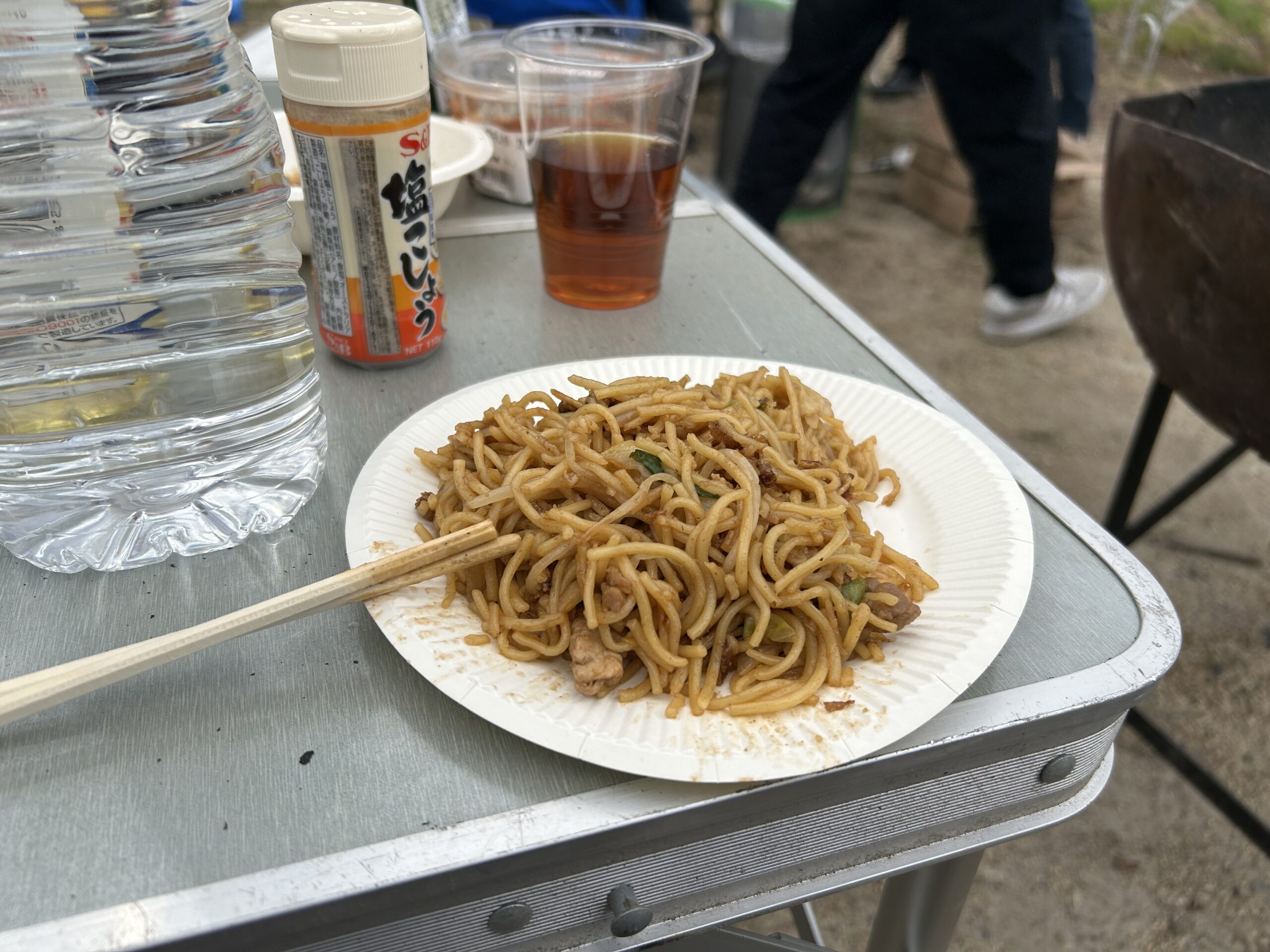 焼きそばもしました、炭火を使って鉄板で作った焼きそばは、少しおこげ部分が出来てパリパリとした食感になって美味しかったです^^
