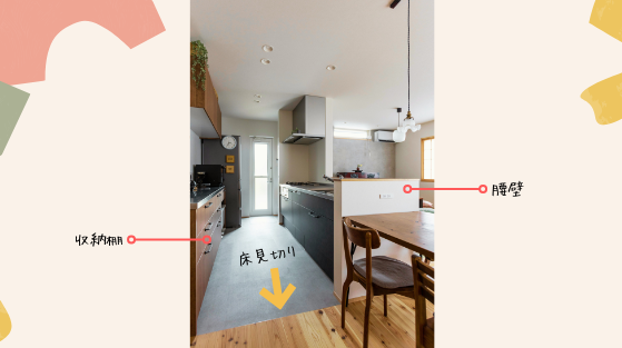 背面の収納棚とキッチン腰壁の位置も一直線に揃え、すっきりと美しい仕上がりに。