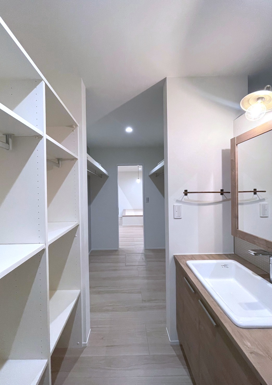 通路には収納や洗面台が設置されているので、歩きながら家事や用事を済ませられるなど、暮らしの動作に無駄がありません。