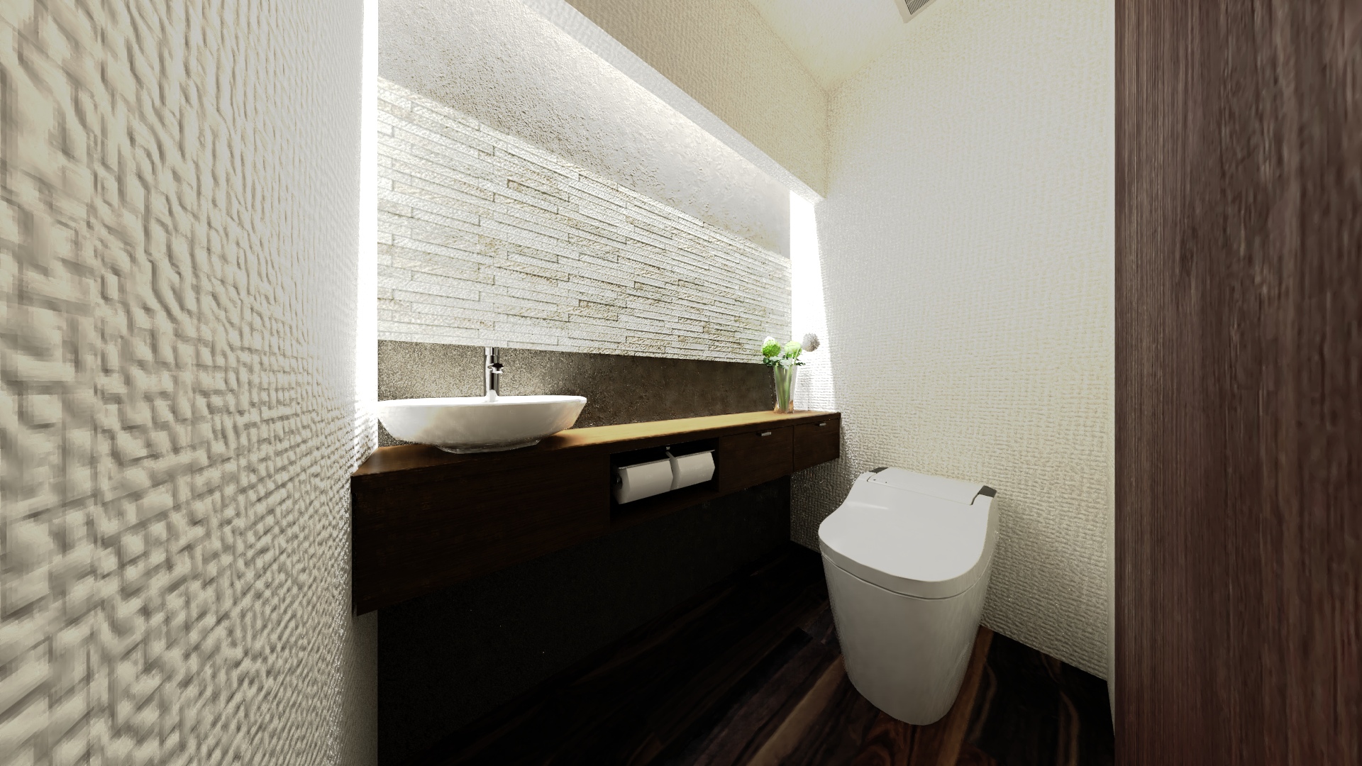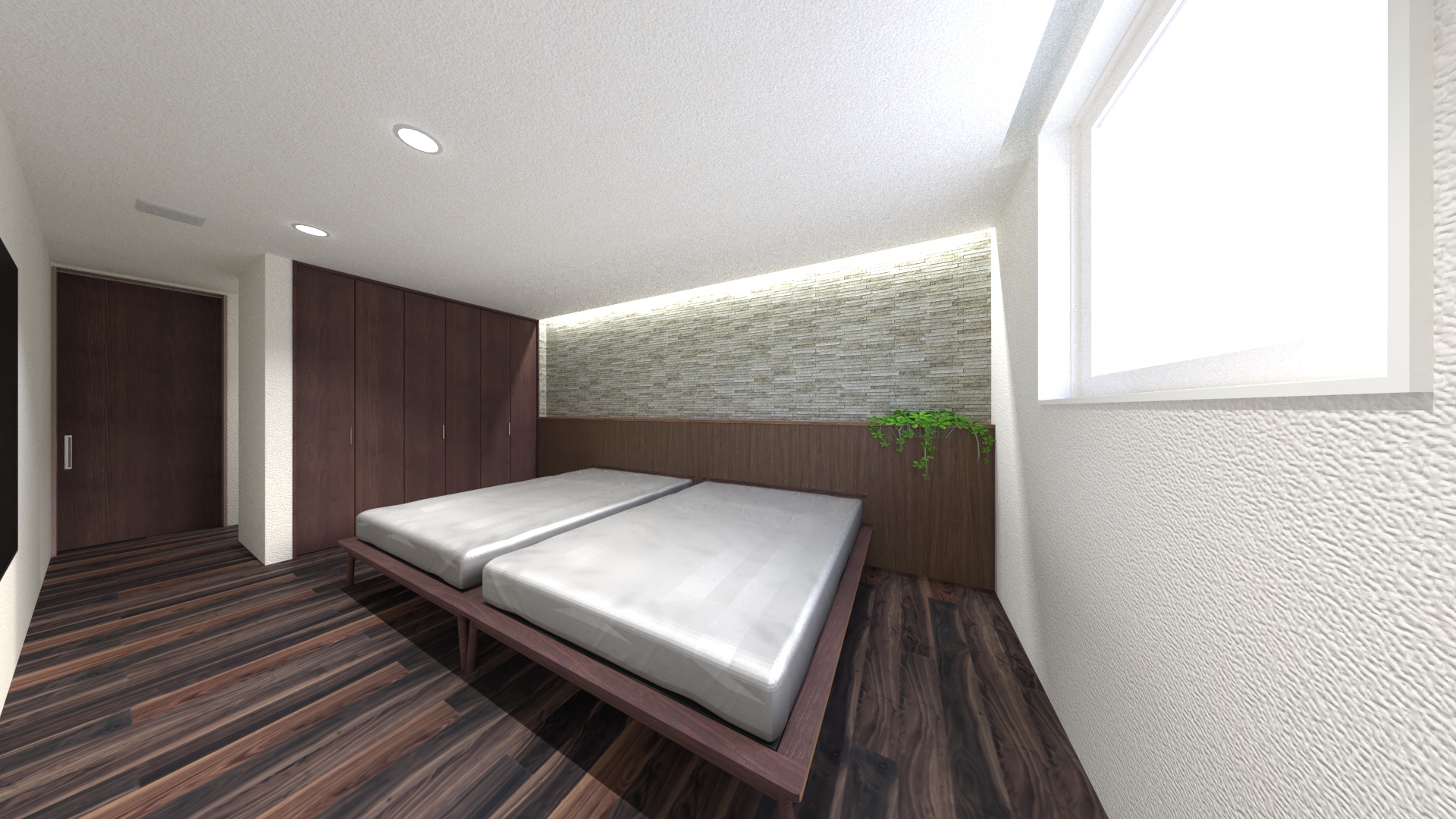■アクセントとしてオシャレなエコカラットの壁や間接照明を寝室やトイレにも採用。