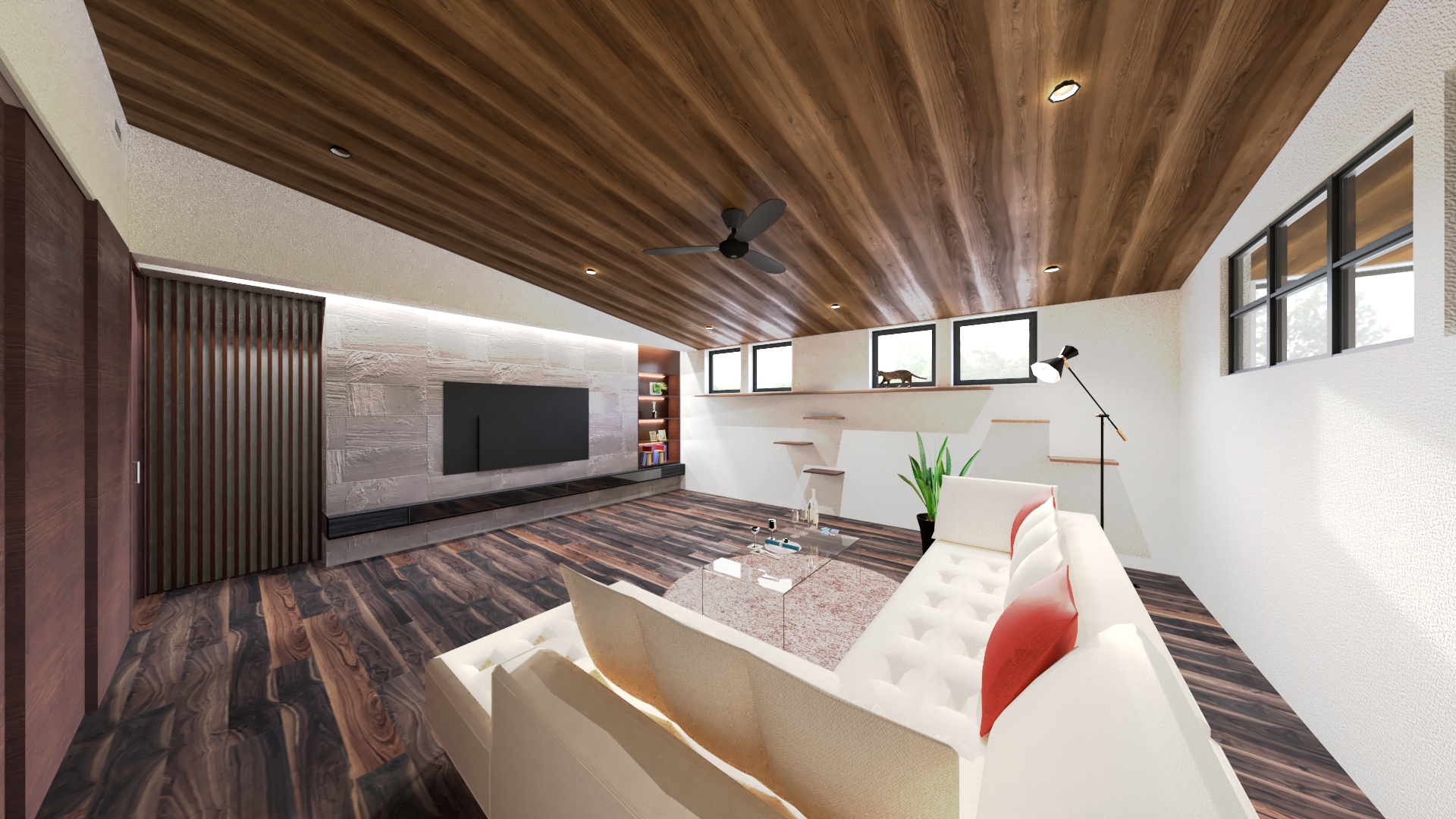 ■リビングのテレビ背面の壁には、上品なデザインのアクセントウォールとしてエコカラットのストーングレースを採用。