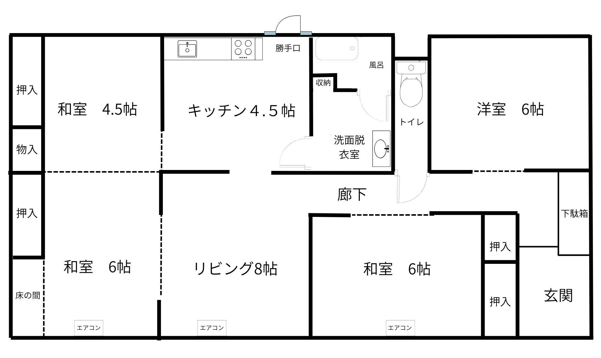 4LDK(和4.5帖・和6帖×2・洋6帖・リビング8帖・キッチン6帖)