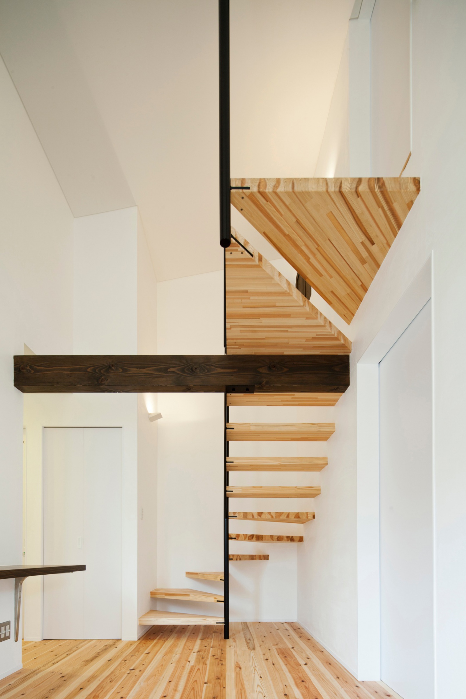 ハイセンスな空間デザインを生む、段板に60ミリの杉板をはめ込んだ鉄骨廻り階段。
