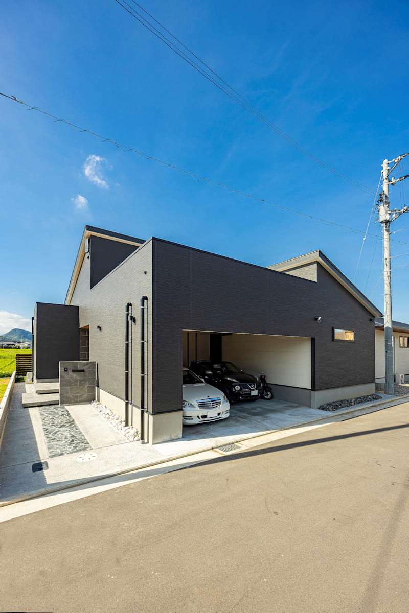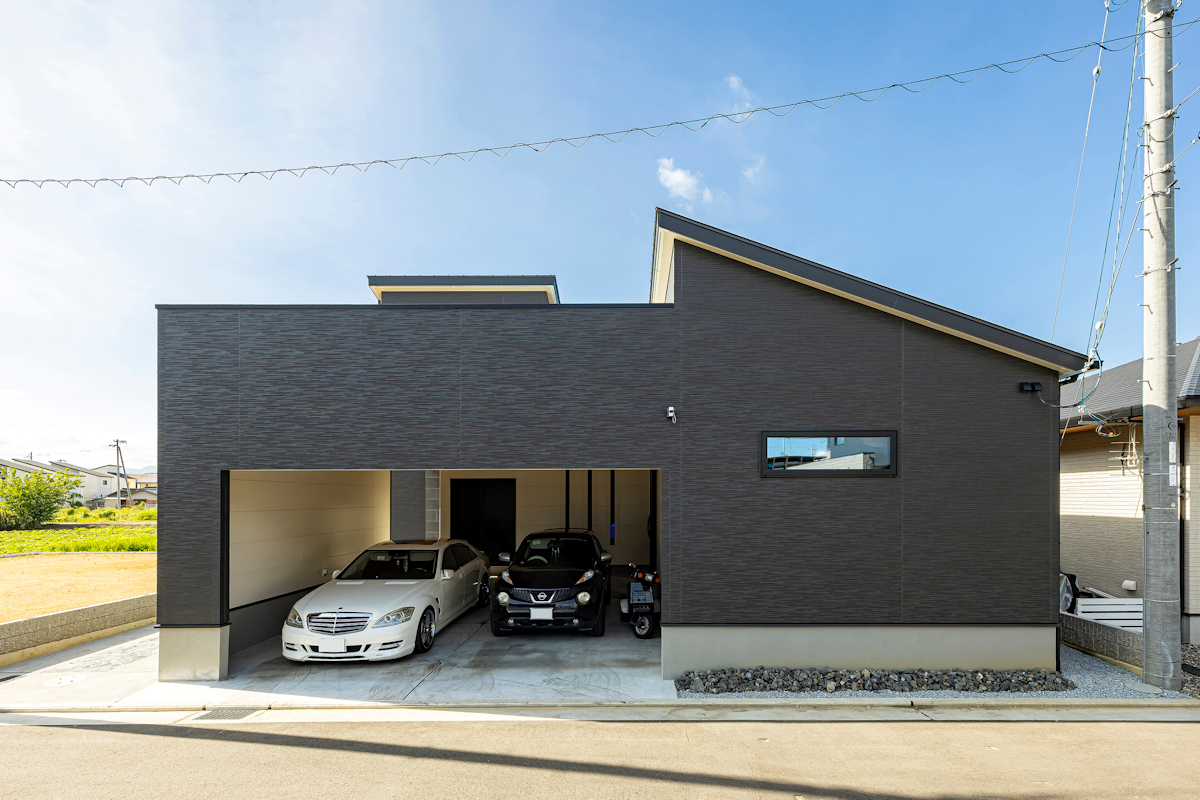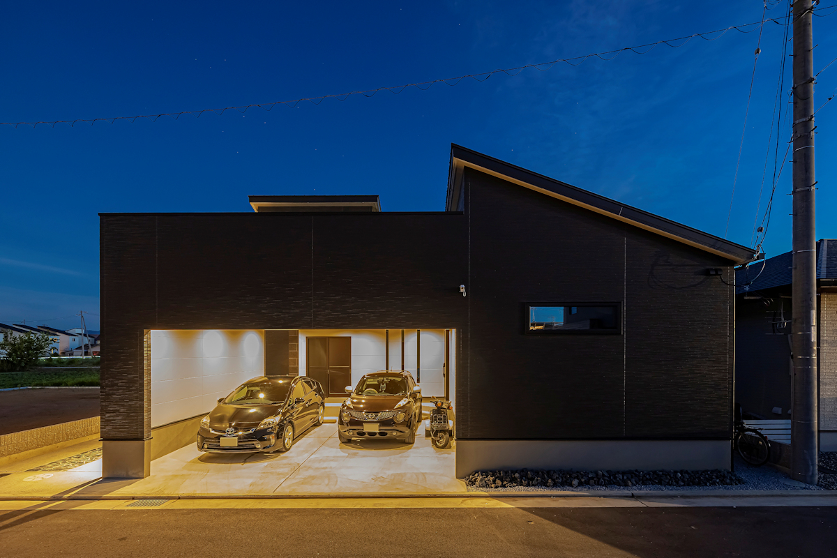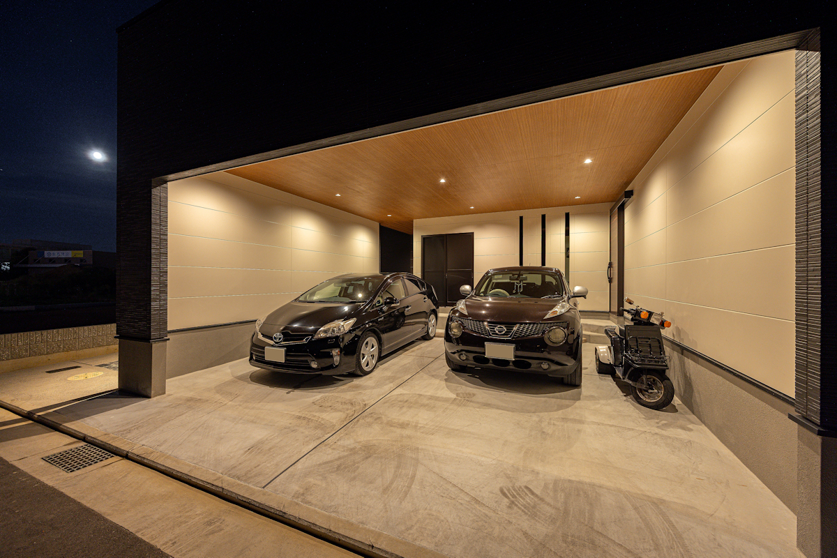 インナーガレージには車2台、ガレージ外にもう1台の駐車スペース。