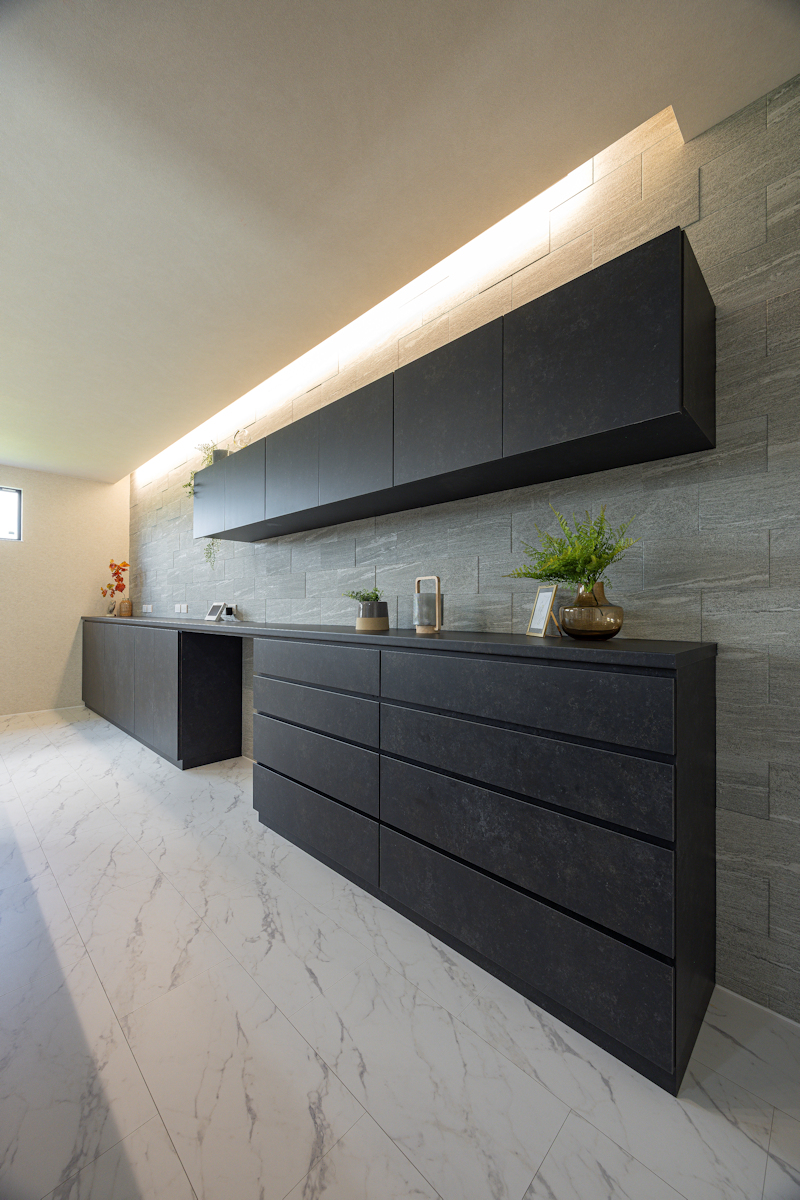 キッチンには5mのお洒落な造作カップボートとエコカラット壁。